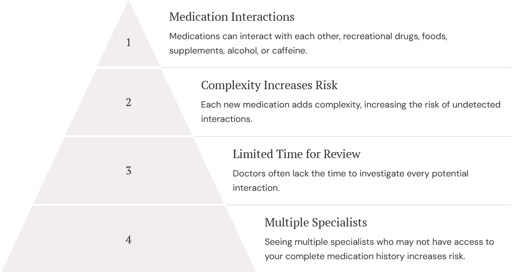 Medications are meant to help you heal, but sometimes, when they interact with each other—or with recreational drugs, foods, supplements, alcohol, or even caffeine—they can compromise your treatment plan. Each new medication adds complexity, so without a thorough review of your regimen, undetected interactions may lead to mild to severe side effects, reduced effectiveness, or even life-altering conditions.